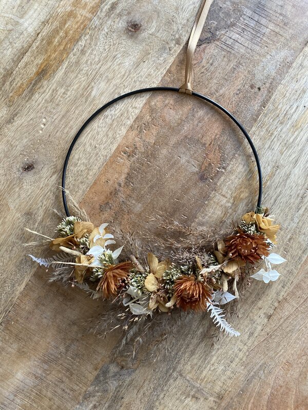 Von edlem Wesen ist Alis und entspricht damit voll und ganz der Bedeutung ihres Namens. Edel und stolz ist dieser Trockenblumenloop. Der schwarze, 20cm Metallring ist auf der Vorderseite mit einer ausgesuchten Auswahl von Strohblumen, Strandflieder, Korallenfarn, Wiesengräsern, Hortensie und Ruscus verziert. Die Rückseite ist mit Schilfrohr abgebunden. Zum Aunfhängen kann ein hellbraunes Schleifenband genutzt werden.