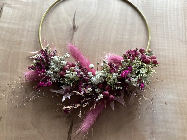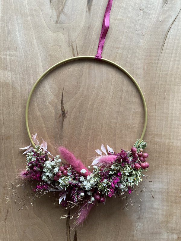 Magst Du intensive Farben? Dann ist Caria genau der richtige Loop für Dich. Caria, die Reine, zieht mit ihrem dunkelrosa, warmen Arrangement alle Blicke auf sich. Der goldene 15cm Metallring ist auf der Vorderseite mit Lagurus, Strohblumen, Strandflieder, Rosa Pfeffer und Erika abgebunden. Zum Aufhängen kann ein rosa Schleifenband benutzt werden.