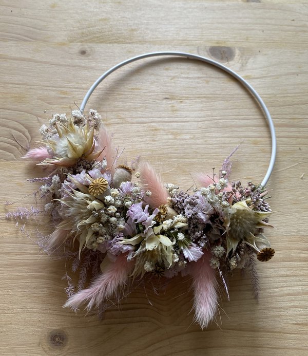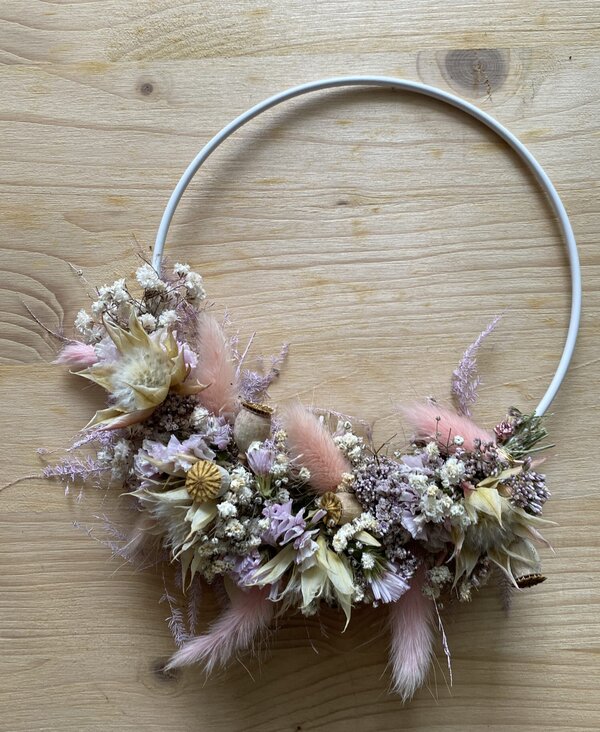 Ditte, Geschenk Gottes! Dieses Arrangement schöpft aus der reichhaltigen Natur und vereint eine Vielzahl von unterschiedlichen Blumen in einem fröhlich, elegantem Loop. Ditte ist einseitig gebunden und hat einen Durchmesser von 15cm. Auf der Vorderseite des Metallrings sind Serruria Florida, Strandflieder, Lagurus, Schleierkraut und Mohnkapseln angebracht. Zum Aufhängen gibt es ein rosa Schleifenband.